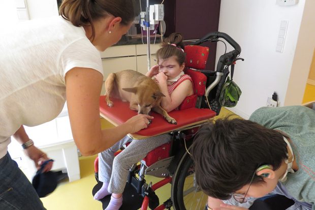 In diesem Kinderhaus in München haben 18 intensivbetreute und künstlich beatmete Kinder – vom Säuglingsalter bis zur Vollendung des Schulalters – ein familiäres Zuhause gefunden. Die Kinder werden dort pflegerisch, pädagogisch und therapeutisch betreut. Unsere Stiftung sorgt für einen regelmäßigen Besuch von speziell geschulten Therapiehunde-Teams bei den Kindern. Diese Einsätze sind sehr emotional und herzergreifend.